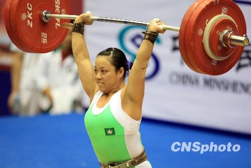10月19日,在全运会女子举重69KG级的比赛中,澳门女“大力士”张少玲在场上积极拼搏的精神,完美展现了澳门运动员的风采,赢得观众阵阵掌声。中新社发 汤彦俊 摄