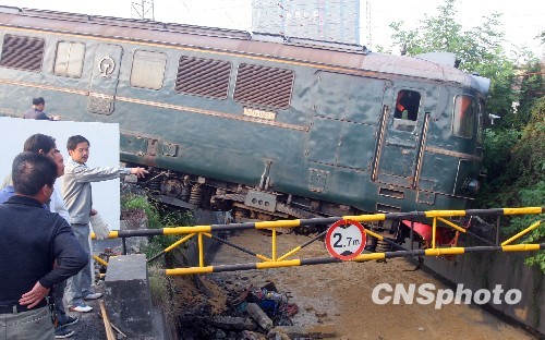 10月19日,救援人员在火车出轨事故现场施救。当日下午两时许,在位于浙江绍兴火车站西面,距离车站不远的寨下铁路桥处冲出铁轨半个火车头挂在铁轨外,幸好无人员伤亡。出事火车为运载铁矿的专用货车,由杭州开往宁波方向,由于货车行驶的是漓渚铁矿货运专线,所以没有对其他客运火车的正常通行造成影响。中新社发 梁永锋 摄