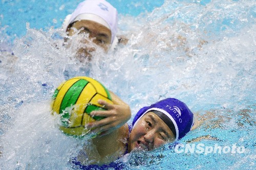 10月20日,在济南举行的第十一届全国运动会女子水球比赛中,天津队四战全胜积8分,夺得冠军。中新社发 富田 摄