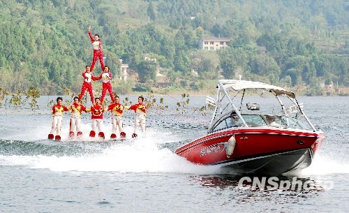 10月20日下午,2009中国·升钟湖钓鱼大奖赛闭幕式上,国家特级滑水队队员表演的多人叠罗汉、双人飞板、6人绕船360、滑板水上芭蕾等赢得人们喝彩。据了解,这次创下吉尼斯世界纪录的全国钓鱼大奖赛在四川省南部县升钟湖景区举行后,中国青年滑水队、中国特技滑水队将升钟湖确定为训练基地。 中新社发 张枥 摄