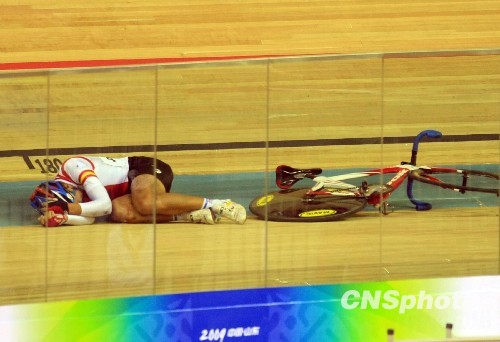 10月21日,第十一届全运会自行车比赛在山东省训练中心自行车馆进行。在男子场地记分赛决赛中,河南选手金龙不慎摔倒受重伤,经过现场简单处理之后被送往医院。据中国自行车协会相关人士透露,金龙的伤最终确诊为右侧肩胛骨骨折。中新社发 汤彦俊 摄