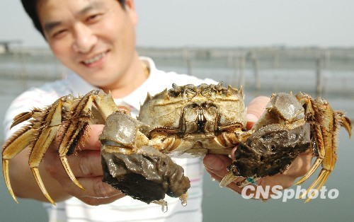 2009年10月21日,苏州工业园区唯唯亭亭蟹农合作社社员曹美秋在阳澄湖里捕获了一只体重达490克、体长42厘米的大闸蟹。据阳澄湖大闸蟹产业协会杨会长确认该蟹是今年自阳澄湖大闸蟹开捕以来最大的一只大闸蟹,堪称“蟹王”。据了解,苏州市有关部门为了保护自然环境、促进生态养殖,2008年自3月起将阳澄湖围网养蟹面积缩减至3.2万亩,并统一更新和规范围网具。因围网面积缩小,阳澄湖水质大大提高,所以今年阳澄湖的大闸蟹个头都特别大。 中新社发 苏民 摄