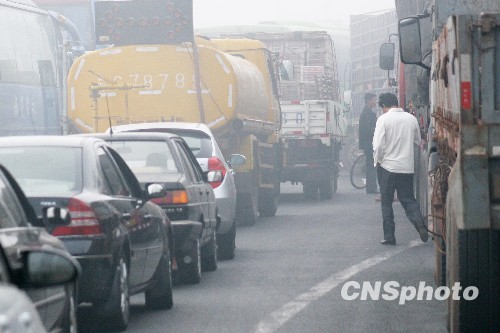 10月22日,受大雾影响,同三高速江苏省赣榆段自凌晨被迫关闭10余小时,数千旅客及车辆滞留,滞留车辆长达近10公里。中新社发 司伟 摄