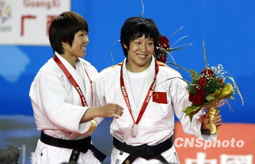10月21日,第十一届全运会柔道女子63公斤级决赛在山东滨州举行,对阵选手是来自山东队的亲姐妹徐玉华(左)、徐丽丽,最终徐玉华战胜妹妹徐丽丽,获得冠军。中新社发 张宇 摄