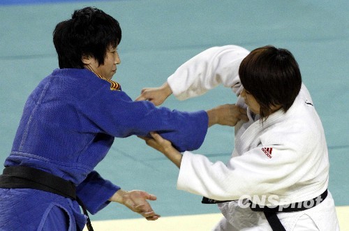 10月21日,第十一届全运会柔道女子63公斤级决赛在山东滨州举行,对阵选手是来自山东队的亲姐妹徐玉华(左)、徐丽丽,最终徐玉华(右)战胜妹妹徐丽丽,获得冠军。中新社发 张宇 摄