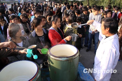 10月22日,河南省博爱县职业中专教师在为07商务班学生分发防治甲型H1N1流感的大锅药。