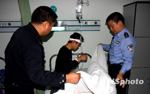 图为办案民警照看伤者的同时询问案情。 中新社发 马卫东 摄