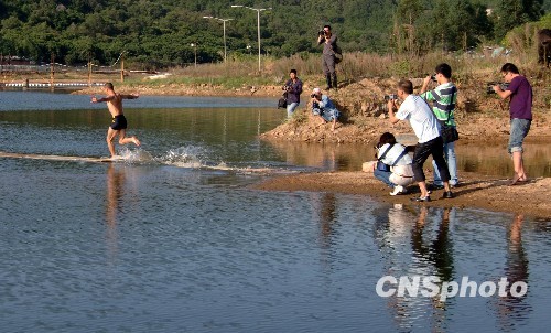 南少林寺武僧"飞"18米 创"水上漂"新纪录 (2)