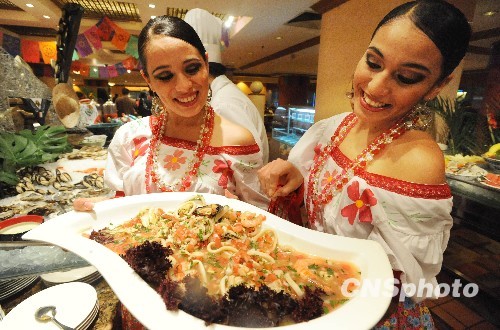 图为两位来自墨西哥的少女正在展示“加勒比海鲜美食”。 中新社发 罗澜 摄