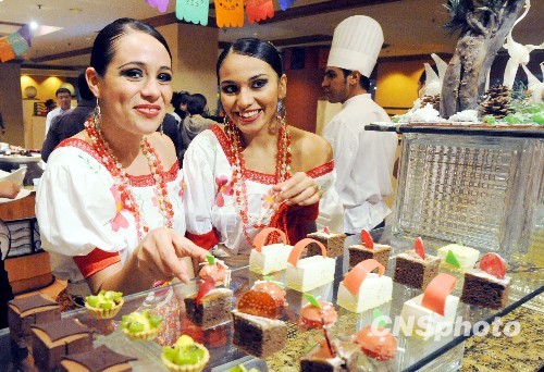图为两位来自墨西哥的少女正在展示“加勒比海鲜美食”。中新社发 罗澜 摄