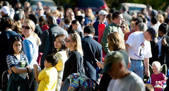 图为美国马里兰州罗克维尔的一家卫生所外人们在排队等待接种甲流疫苗。
