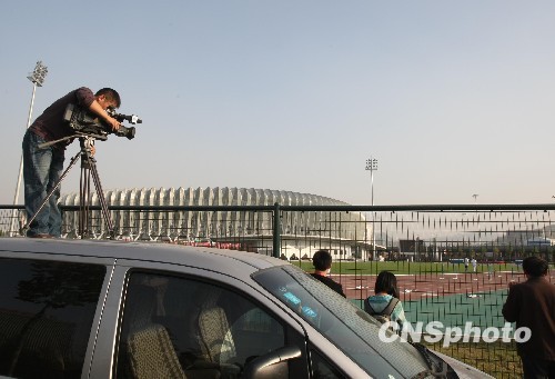10月22日下午,“飞人”刘翔首次亮相济南奥体中心田径训练场,进行赛前训练,大批记者前去“探班”,不少记者甚至爬上了车顶。中新社发 汤彦俊 摄