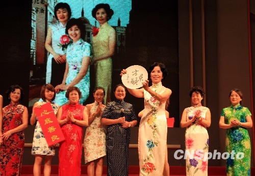 上海一家庭七位女性,四代同堂登台演绎旗袍魅力,其中包括一岁女孩和七十七岁阿婆,成为当日《旗袍,向世博走来》大型汇报演示中最引人注目的一幕。中新社发 潘索菲 摄