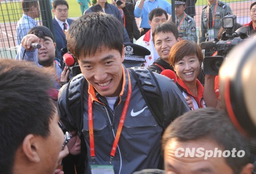 组图:刘翔亮相全运会训练场 笑对媒体(3)