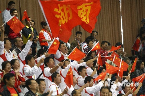 图为湖南队队员在赛场一起唱起了名歌“浏阳河”为龙清泉助威。中新社发 富田 摄