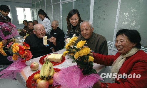 10月20日,一年一度的重阳节即将到来,辽宁省义县图书馆青年志愿者走进敬老院,送去各种图书同时,和老人们赏菊、登高、吃重阳糕,传承中华民俗文化,开展尊老敬老活动,共享节日欢乐。中新社发 李铁成 摄
