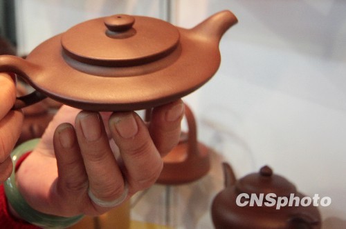 10月25日,世界最扁紫砂壶亮相北京国际茶叶博览会,吸引观众纷纷驻足观赏。该紫砂壶高19.07毫米、宽119.53毫米容积41.92毫升由宜兴紫砂艺人秦午南创作的,去年被上海大世界吉尼斯总部确认为“世界上最扁的紫砂壶”。中新社发 吴芒子 摄