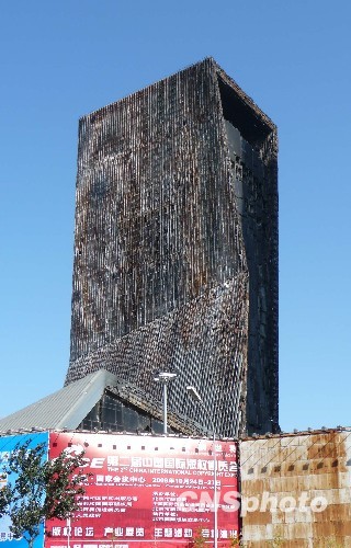 2009年10月26日,北京央视新址大楼配楼在过火大楼的南侧,已经搭起了数米高的脚手架,现场工作人员表示,该楼将重新进行外墙装修。中新社发 玉龙 摄
