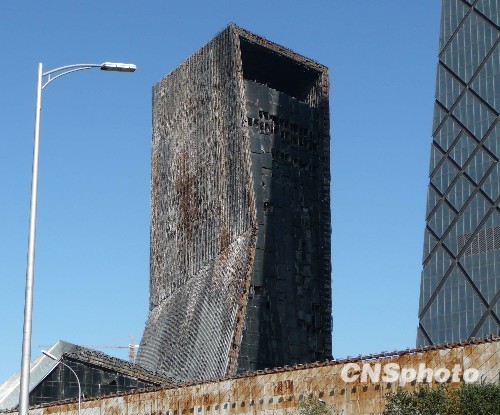央视新址过火大楼搭起脚手架准备修复(6)