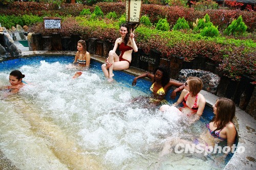 来自来自全球五大洲40多个国家和地区的超级模特在江西庐山天沐温泉身着泳装,尽情戏水。中新社发 张俊 摄