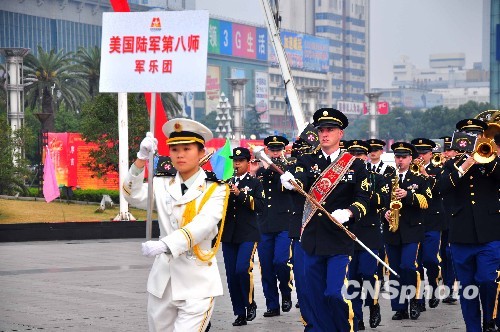 图为美国陆军第八师军乐团通过南昌八一广场进行军乐游行。中新社发 马裕淇 摄
