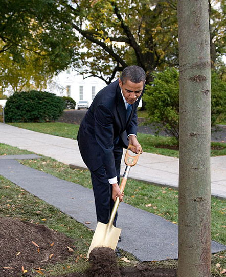 10月28日,美国华盛顿,总统奥巴马在白宫北草坪上植树。