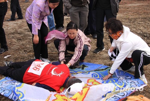 10月28日,在江苏如东“洋口港”杯2009年全国风筝锦标赛场上,来自江西省九江市风筝协会代表队“846”号参赛队员突然晕倒,不省人事。正在现场执行救护任务的如东县人民医院医生闻讯赶到事发地,立即实施抢救并抬上救护车,赶往如东人民医院抢救。相关领导也赶往医院要求尽全力救治。到记者发稿时,从人民医院重症病房了解到,该运动员还在病危中。中新社发 王必春 摄