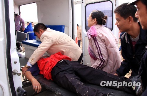 正在现场执行救护任务的如东县人民医院医生闻讯赶到事发地,立即实施抢救并抬上救护车,赶往如东人民医院抢救。中新社发 王必春 摄