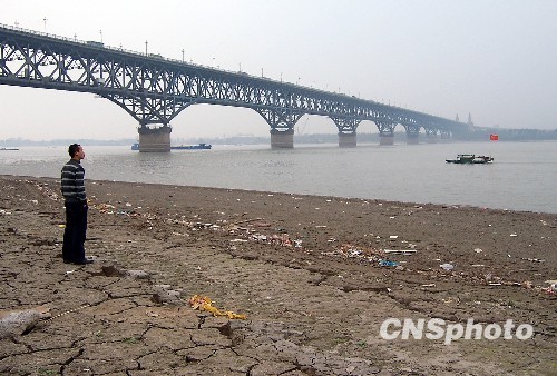 2009年10月29日,长江南京下关段河床裸露。江苏省南京市防汛防旱指挥部召开的新闻发布会透露,受上游来水减少影响,长江南京段最低水位降至3.22米,仅高于1978年,创30年以来最低。目前,长江南京段大片近岸河床裸露,不少货轮空载或半载通航,江边渔民渔获量也减少。中新社发 安东 摄