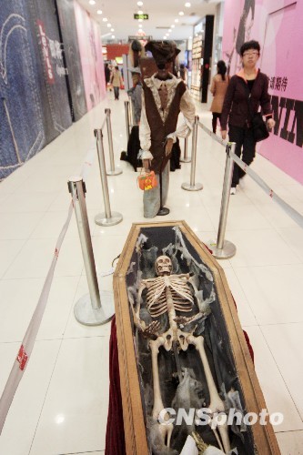 万圣节将至,北京一家商场摆放“吸血鬼、僵尸、骷髅”等仿真玩偶。中新社发 吴芒子 摄