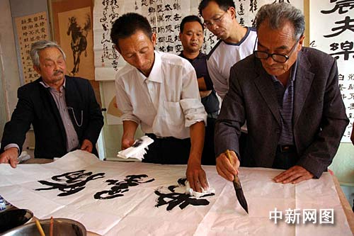 中新网10月30日电 (记者 齐永 通讯员 杨正华) 河南省淮阳县白楼乡农民书法家齐修杰为了多与同行交流书艺,广交朋友,自费办起了一处书画交流中心。该中心陈列着他近百幅自创的讴歌新农村和表现新农民风采的书法作品,是他多年苦练书艺创下的结晶。