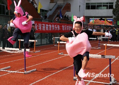 10月30,福建武夷山举办趣味运动会比赛,通过踩气球、卡通跨栏等各种新奇有趣的项目竞赛,倡导全民健身,培养团队合作。图为当地两名男子分别扮成卡通小猪与小鹿进行跨栏比赛。中新社发 周文杰 摄