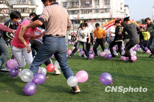 10月30日,福建武夷山举办趣味运动会比赛,通过踩气球、卡通跨栏等各种新奇有趣的项目竞赛,倡导全民健身,培养团队合作。图为当地百余男女正在进行踩气球比赛。中新社发 周文杰 摄