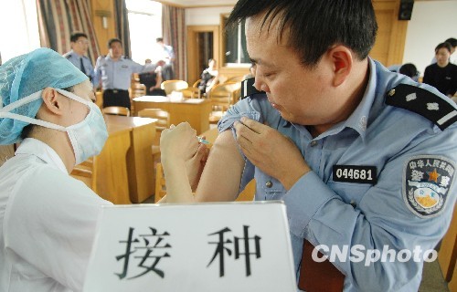 2009年10月30日,当日,苏州市启动“重点服务人员”的甲型H1N1流感疫苗的免费接种工作,苏州市第一看守所的200余位管教民警,成为首批甲流疫苗接种者。据悉,接下来苏州免费接种的“重点服务人员”包括甲流收治临床一线的医护人员、公共服务人员、出入境检疫人员、教师以及学生等。 中新社发 苏民 摄