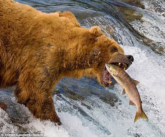 图:摄影师拍到母灰熊教幼仔捕鱼瞬间(2)