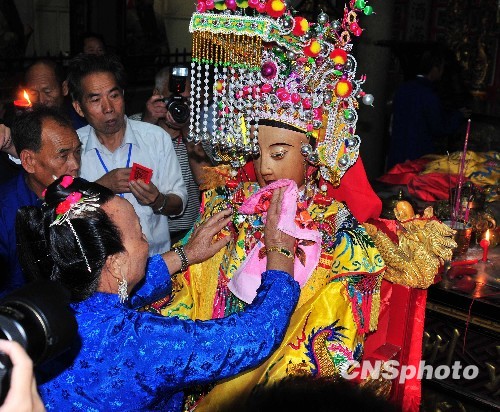 图为妈祖协会德高望众的70多岁的湄洲娘为妈祖金身梳洗。中新社发 张丽君 摄