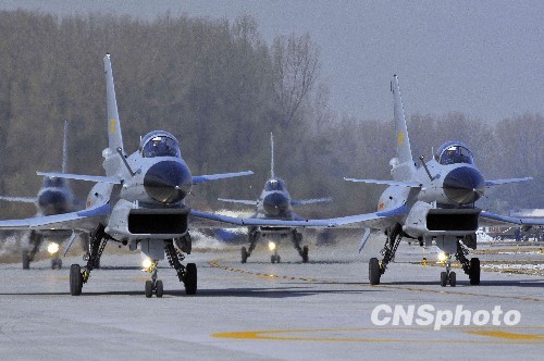 图为歼十战机“牵手”出发。中新社发 潘旭临 摄