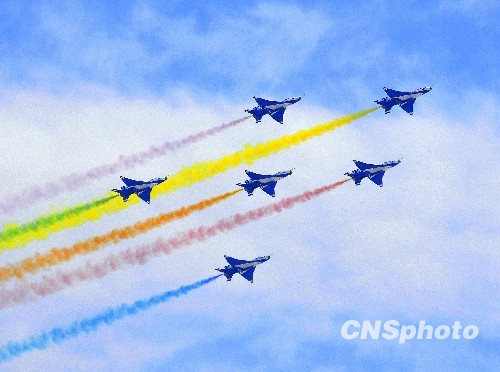中国空军举行纪念建军六十周年飞行、跳伞预演(5)