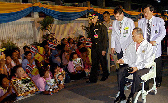 11月2日,坐在轮椅上的泰国国王普密蓬·阿杜德(前右一)在曼谷诗里叻医院向民众致意。