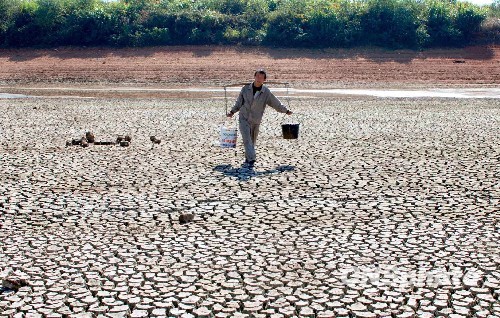 11月4日,乐平市众埠镇方家村干涸的何家源水库,当地村民在挑水。7月份以来,江西乐平市出现持续晴热少雨天气,8月1日至今降雨量仅为55.6mm,使得该市旱情十分严重,全市农作物受旱面积达9.91千公顷。 中新社发 朱定文 摄