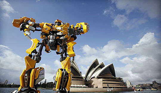 11月5日,变形金刚“大黄蜂”在澳大利亚悉尼歌剧院和悉尼港大桥前“现身”。这尊雕像是为了电影《变形金刚2》全球巡展设立的,用以宣传这部电影于5日上市的DVD和蓝光光盘。