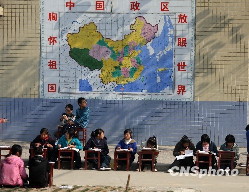 陕西高陵学生们露天上课避震。中新社发 梁萌 摄