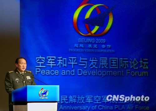 11月6日,中国人民解放军空军成立60周年“空军和平与发展国际论坛”,在北京新世纪日航饭店举行,国务委员兼国防部长梁光烈上将致辞,空军副司令陈小工中将主持论坛。