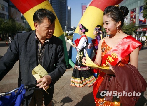 11月9日是“119消防日”,身着传统民族服装的26位少数民族消防形象大使走上昆明街头,向市民发放消防宣传材料普及消防知识。中新社发 刘冉阳 摄