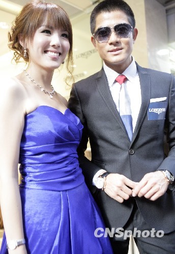 图为形象大使郭富城出席剪裁仪式并与香港艺人杨洛婷合影。中新社发 张勤 摄