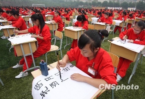 11月10日,重庆市女子职业中学操场上,千名重庆市中师幼师学生举行“毛笔、硬笔、粉笔”书法素质大赛,弘扬中华传统文化。中新社发 贺终荣 摄