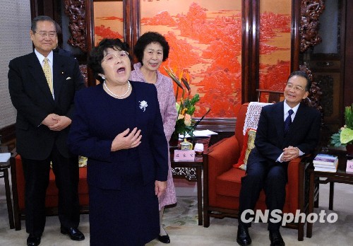 11月11日,中国国务院总理温家宝在北京中南海紫光阁会见了由野田毅、池田澄江率领的“日本遗孤感谢中国人民养育之恩访华团”。图为日本遗孤为温家宝演唱改编歌曲“说句心里话”描述过往经历。中新社发 廖攀 摄