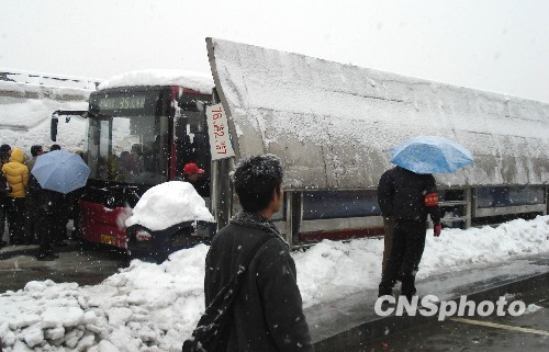 11月11日,河北石家庄已遭受持续48小时的强降雪,降雪量超过74毫米,打破54年来的最高纪录。图为石家庄公交枢纽站候车亭顶被积雪压塌。中新社发 宋敏涛 摄