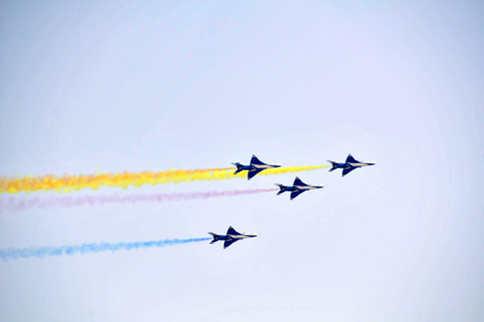 15日上午,人民空军成立60周年飞行表演在沙河机场举行。图为歼7GB四机编队。