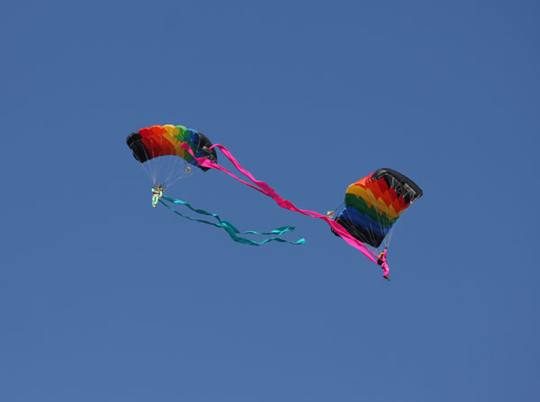 15日上午,人民空军成立60周年飞行跳伞表演在沙河机场举行。图为“仙女下凡”跳伞表演。